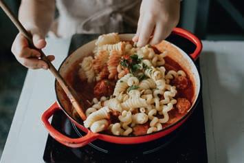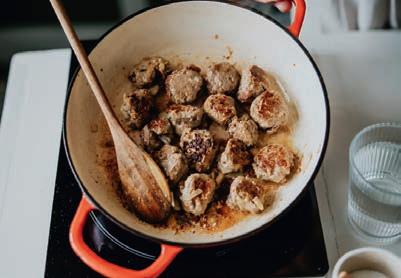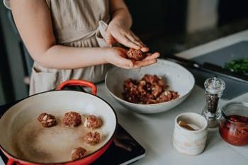 5 Tõsta kaks kulbitäit pasta keeduvett pannile lihapallide juurde.