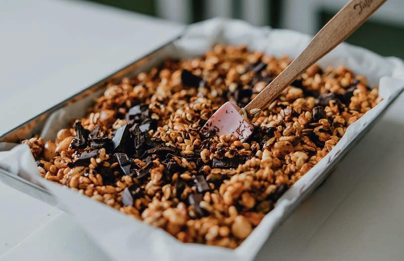 6 Kui segu on saavutanud kuldse jume, võta plaat ahjust välja ja raputa kuuma krõbuski peale šokolaaditükikesed. Sega kergelt läbi ja lase segul plaadil maha jahtuda.