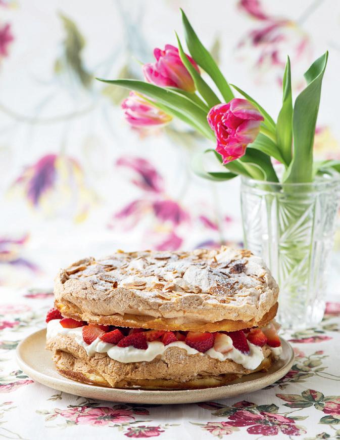 Pane mõned maasikad kaunistamiseks kõrvale ja viiluta ülejäänud. Tõsta üks alus tordialusele besee üleval, määri peale kreem ja pane viilutatud maasikaid. Tõsta teine põhi peale.