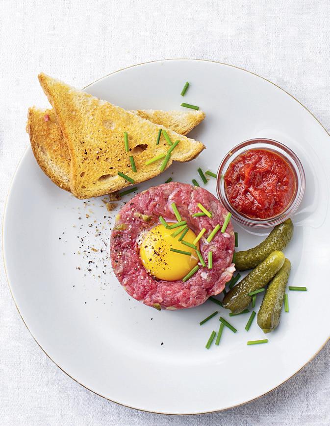 Sega kokku kastmeained ja maitsesta soola-pipraga. Vormi lihamassist 2 pätsikest, aseta taldrikutele, vajuta keskele süvend ja säti sinna munakollane. Serveeri juurde röstitud saia ja kastet.