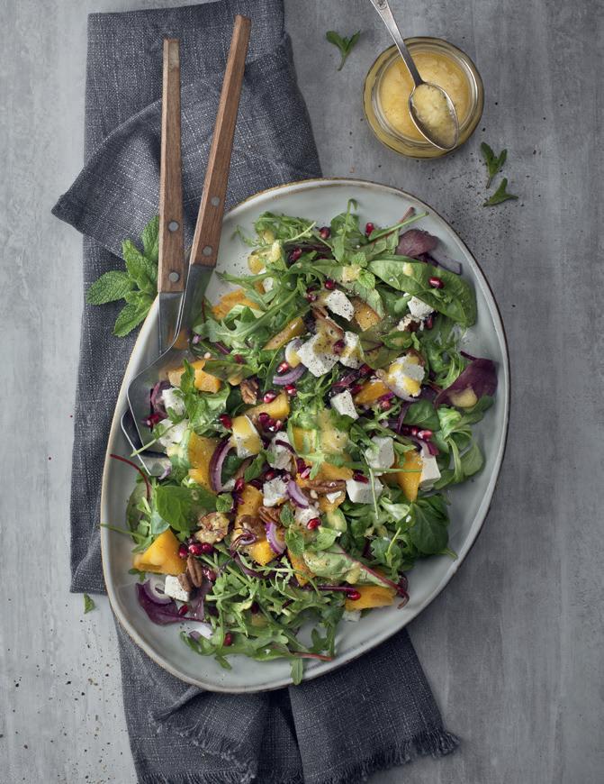 Rösti pähklid kuival pannil, haki ja puista salatile koos granaatõunaseemnetega. Püreesta kastmeained saumikseriga ja nirista salatile.