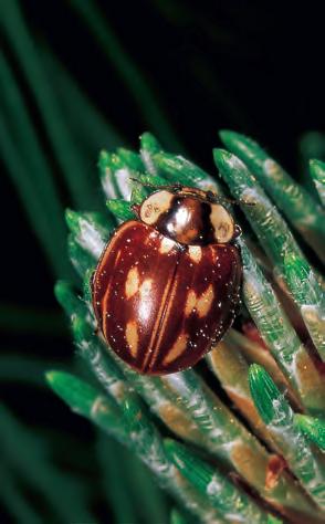 Tasub teada! Seitsetäpp-lepatriinu on tuntud lehetäide hävitaja. Mitte ainult tema ise, vaid ka sinakashall, kollaste laikudega tähistatud vastne (väike foto) toitub pea eranditult vaid lehetäidest. Arenguks vajab ta neid umbes 600. Samas ei sobi talle mitte kõik lehetäide liigid; näiteks leedri-lehetäi (ð lk 66) on tema jaoks surmavalt mürgine.