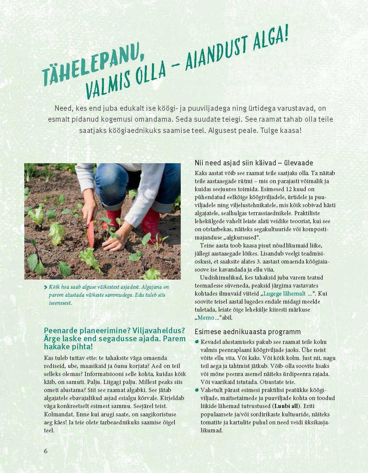 See eriväljaanne tahab olla teile järgmisel kahel aastal saatjaks köögiaednikuks saamise teel. Kõik hea saab alguse väikestest asjadest. Peenarde planeerimine? Viljavaheldus? Tahaksime väga omaenda rediseid, ube, maasikaid ja õunu korjata. Aed on teil selleks olemas. Informatsiooni selle kohta, kuidas kõik käib, on samuti. Palju. Liigagi palju. Millest peaks siis ometi alustama? Siit see eriväljaanne algabki. See jätab algajatele ebavajalikud asjad esialgu kõrvale. Kirjeldab väga konkreetselt esimest sammu. Seejärel teist. Kolmandat. Enne kui arugi saame, on saagikoristuse aeg käes! Ja teie olete tarbeaednikuks saamise õigel teel. Siit leiab ka aastaaegade rütmi – mida parajasti teha ja kuidas toimida. Esimesed 12 kuud on pühendatud eelkõige köögiviljadele, ürtidele ja puuviljadele ning viljelustehnikatele, mis kõik sobivad hästi algajatele, sealhulgas terrassiaednikele. Praktiliste lehekülgede vahelt leiab alati veidike teooriat, näiteks segakultuuride või kompostimajanduse „algkursused“. Teine aasta toob ka