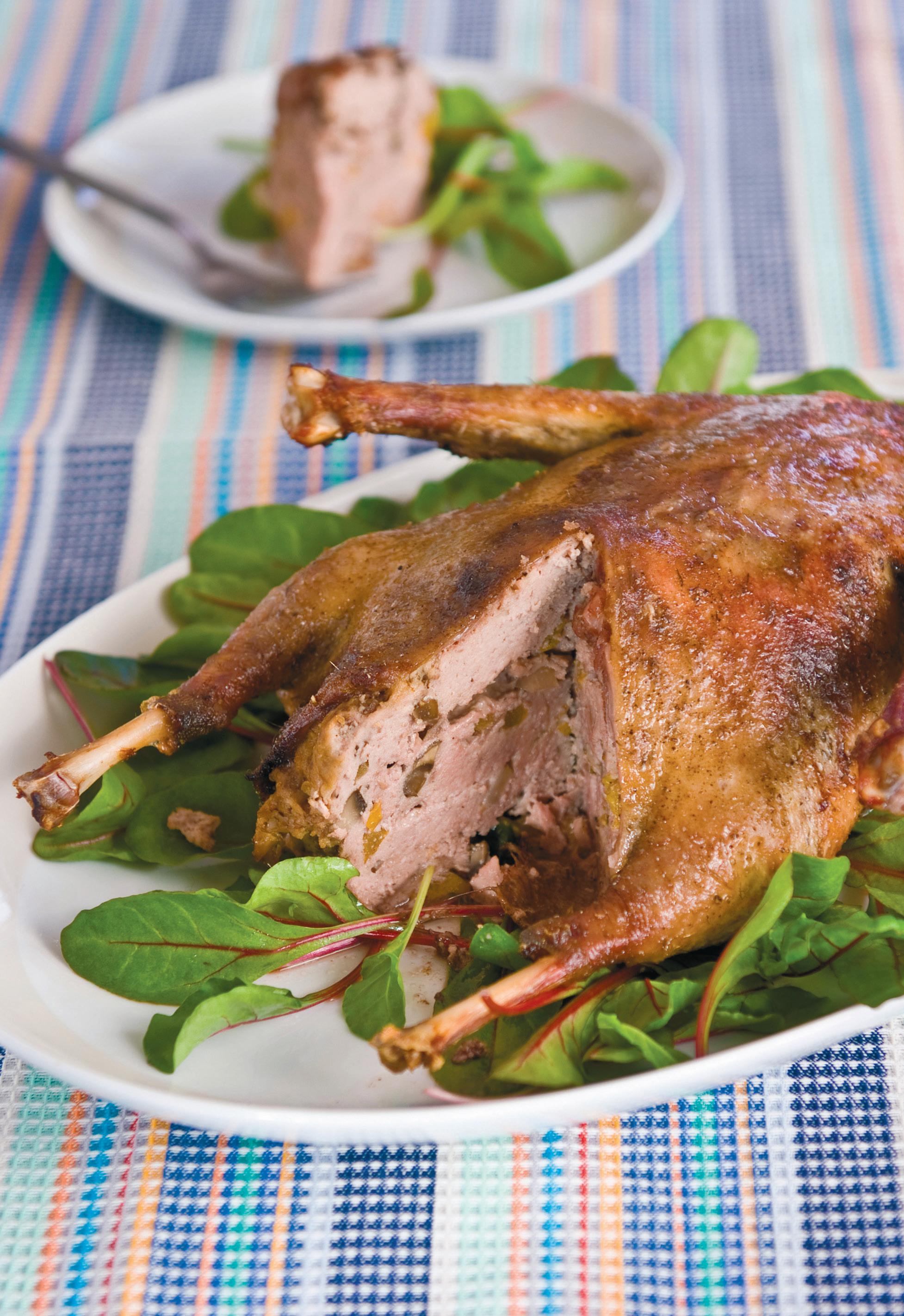 Seejärel lõika hanel ära kõik luud. Alusta sisselõikega täpselt rinnakiilu juurest ja liigu väiksema terava noaga tasakesi mööda hane luustikku seljaosa poole. Nii jääb nahk ja kogu pehme haneliha ühe tükina terveks ning luud, välja arvatud koivad ja tiivad, saavad eemaldatud. Seejärel lõika rinnafilee ettevaatlikult õhemaks, kuid nii, et veidi liha jääb ka naha külge. Raputa peale veidi soola ja pipart ning alusta täidise valmistamist.