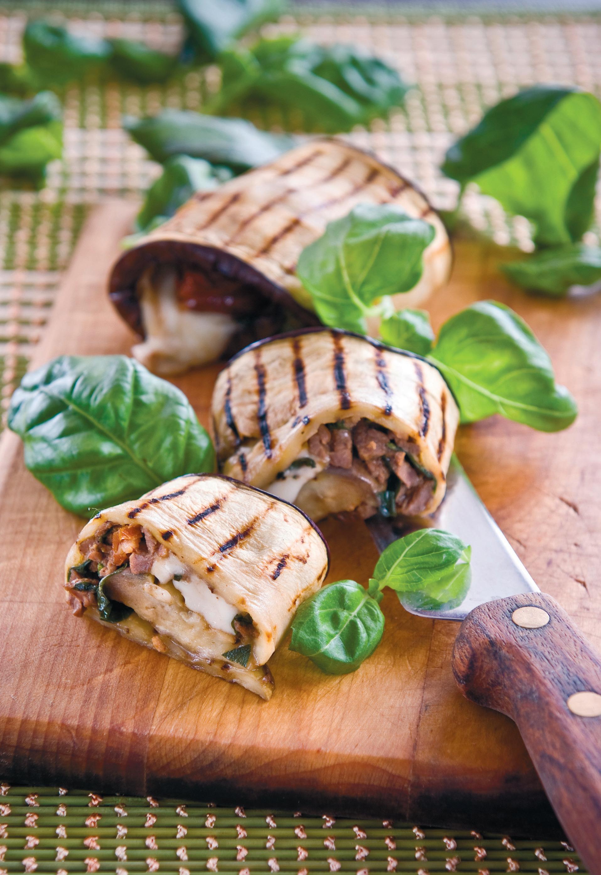 Täidiseks sega hakitud mozzarella, viiludeks lõigatud kirsstomatid, peekon, spinat ja liharibad hoolikalt kokku. Kaabi baklažaaniviiludelt maha sool, pintselda need mõlemalt poolt oliiviõliga ja grilli kuumal ribilisel grillpannil mõlemalt poolt 3 minutit. Tõsta lusikaga igale lihaviilule 1–2 sl täidist, rulli kokku, kinnita rullid diagonaalis grilltikuga ja lao ahjuplaadile. Küpseta 180kraadises ahjus 10–11 minutit, kuni mozzarella hakkab sulama. Serveeri soojalt.
