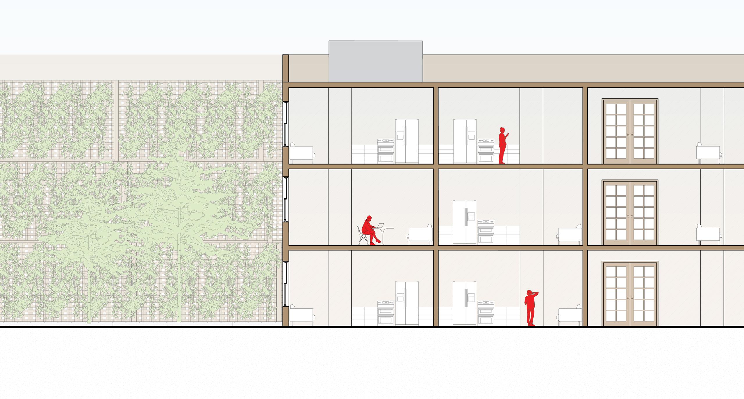 The privacy offered by the terraces creates intimate moments for residents shared equally in each unit. The terrace itself also becomes a larger public feature as each individual resident is responsible for nurturing their shared green space. As this unified responsibility blossoms, passive shading becomes shared amongst all units in Ithaca’s warmer months.