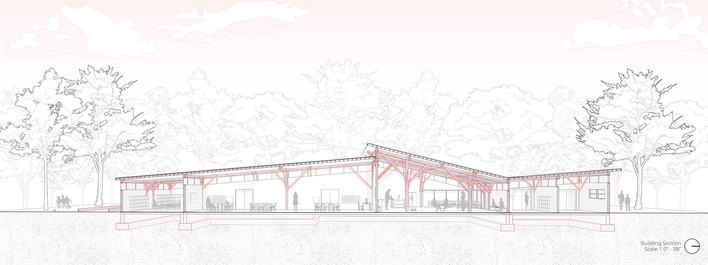 The anatomy of the white pine was also beneficial in creating a natural heating and ventilation system for the project. In the first phase of construction, we constructed a centralized gathering space with an indoor firepit. As a means of ventilating smoke, we employed a slanted roof system to regulate interior conditions during occupation annually.