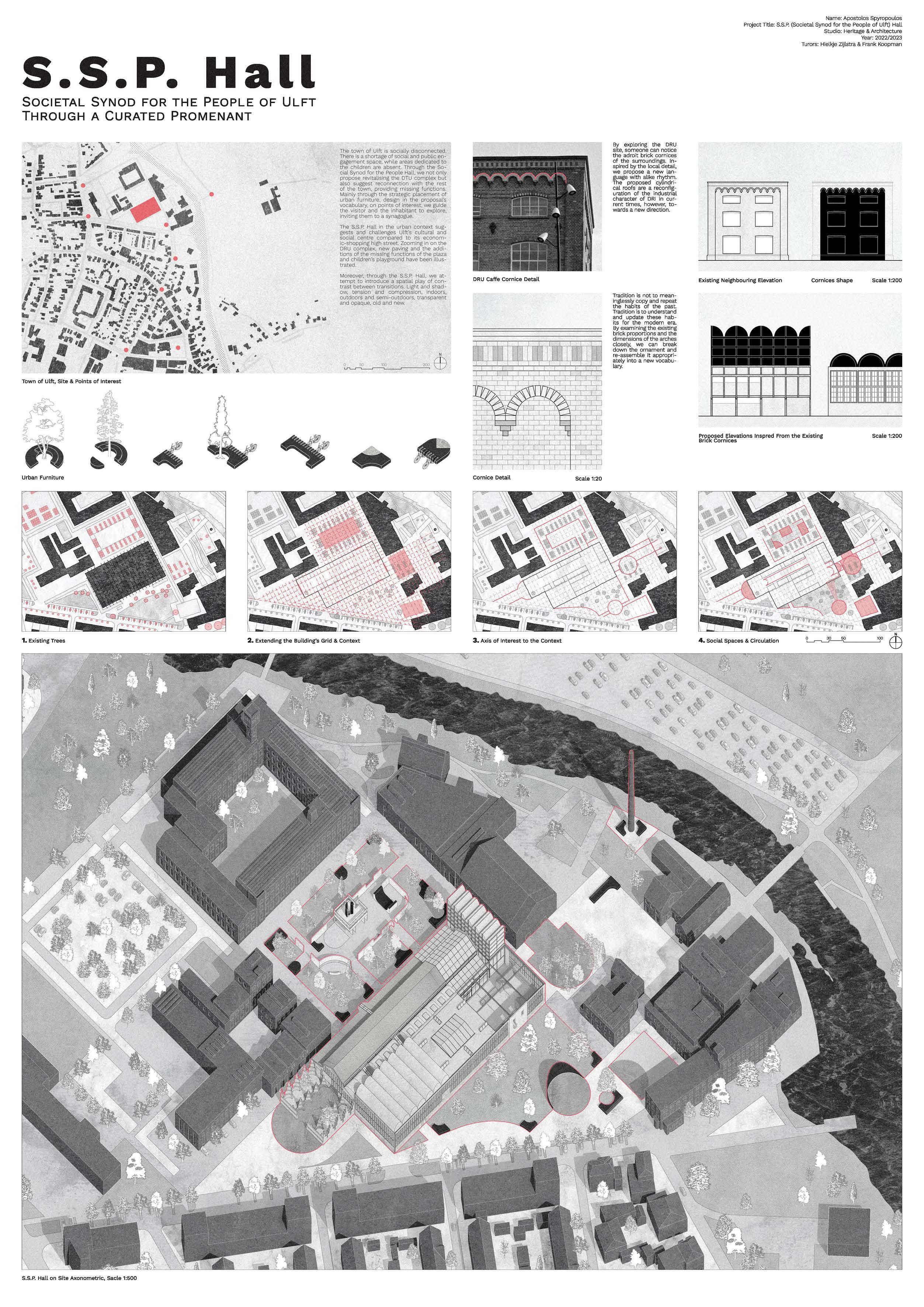 The town of Ulft is socially disconnected. There is a shortage of social and public engagement space, while areas dedicated to the children are absent. Through the Social Synod for the People Hall, we not only propose revitalising the DTU complex but also sugest reconnection with the rest of the town, providing missing functions. Mainly through the strategic placement of urban furniture, design in the proposal’s vocabulary, on points of interest, we guide the visitor and the inhabitant to explore, inviting them to a synagogue.