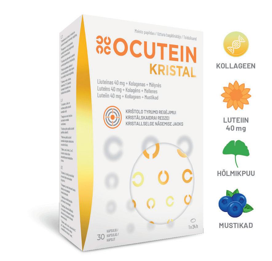 Silmavitamiin Ocutein Kristal kapslid 40 mg (30 tk 24,44 €) on loodud teravdama ja säilitama nägemist, toetama ja hoidma silmade elastsust.