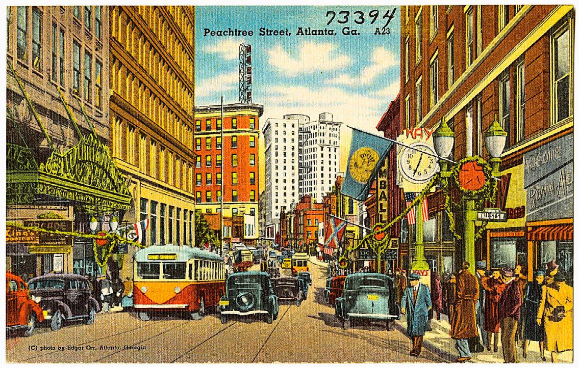 Postcard of Peachtree Street, Atlanta, issued circa 1930-1945.