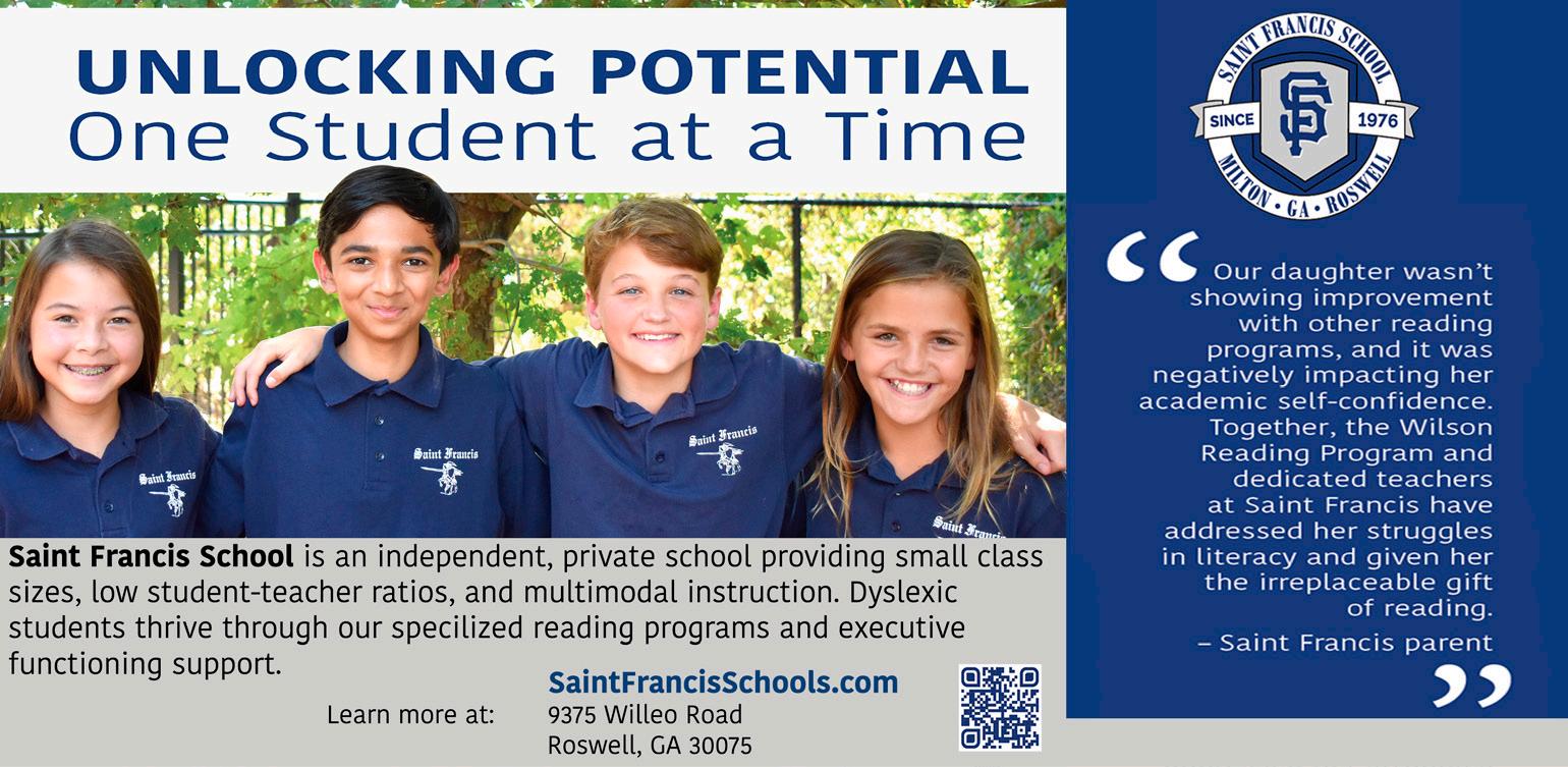 Saint Francis School is a SACS/SAIS accredited, independent, non-profit, nonsectarian college preparatory school founded in 1976. The mission of Saint Francis School is to provide a college preparatory program to students with diverse academic abilities in a structured environment that is challenging and supportive. Kindergarten – 8th grades are located on the 24-acre gated Roswell Campus while the High School is located on the 47-acre gated Alpharetta campus.