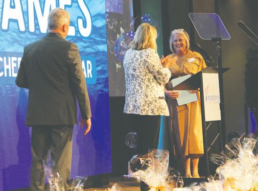 From left, Forsyth County Schools Superintendent Jeff Bearden and School Board Chairwoman Darla Light name Dawn James the district’s 2024 Teacher of the Year at an event March 14. James teaches eighth grade at Lakeside Middle School.