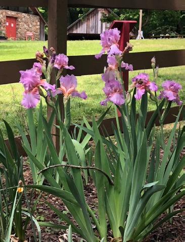 Homemade raised beds with fencing to keep out deer and also used for trellises. Irises at Autrey Mill Nature Preserve