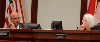 Krause Sports and Entertainment CEO Vernon Krause, left, and his attorney, Ed Dovin, speak to School Board members Aug. 13 about benefits The Gathering would bring to the county.