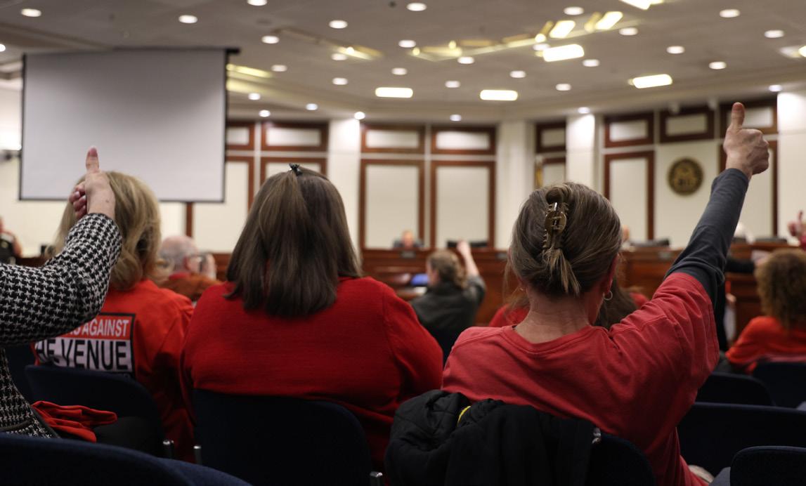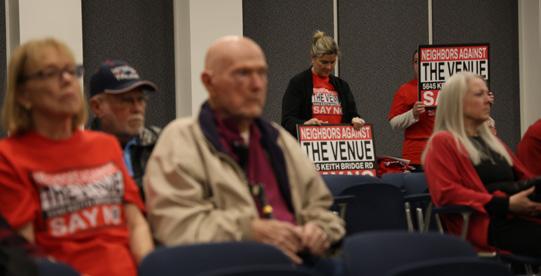 Residents wear red shirts signifying their opposition to a proposed event venue near Coal Mountain on Keith Bridge Road during a Jan. 22 Forsyth County Commission meeting.