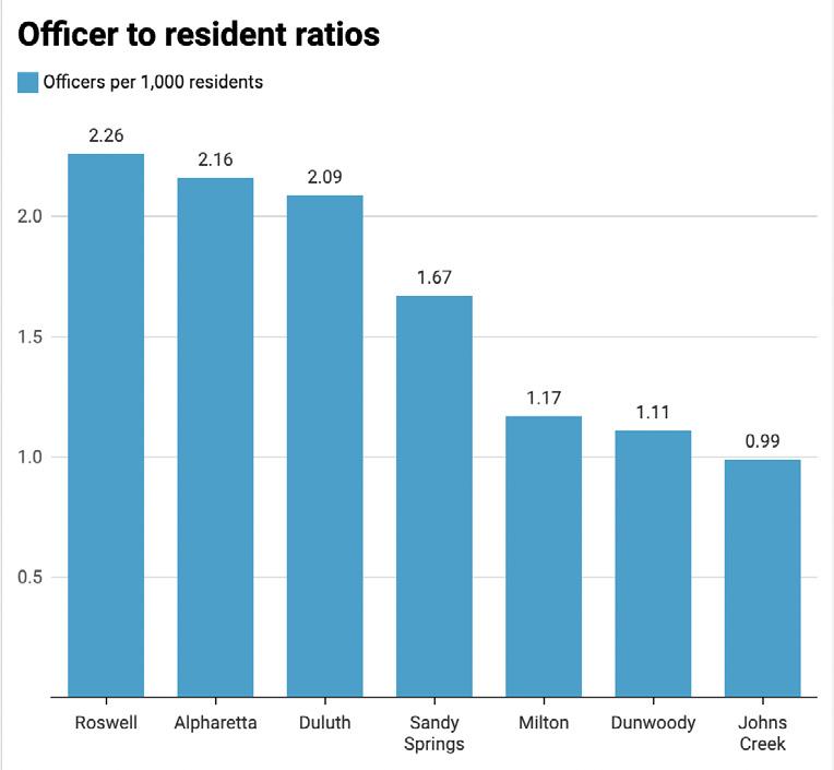With more than 67,000 residents, Alpharetta has 2.19 officers per 1,000 residents, and Roswell with a population of nearly 93,000 has 2.26 officers per 1,000 residents. The officer-to-resident ratio in Sandy Springs, Milton and Dunwoody also exceed numbers in Johns Creek.