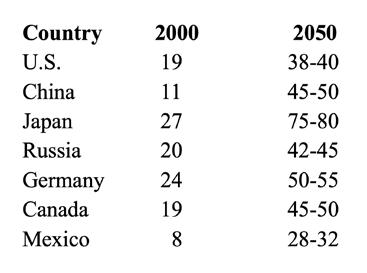 Projected total population change from the year 2000 to projected 2050 for select countries is as follows: U.S.: +35%; Mexico: +50%; Canada: + 29%; China: 0%; Germany -13%; Japan: - 17%.