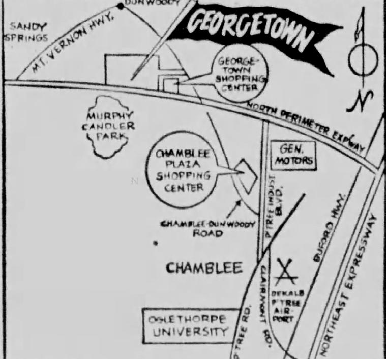 A map accompanied the advertisement for the new Georgetown subdivision in the 1961 Atlanta Journal, indicating the future Georgetown Shopping Center.