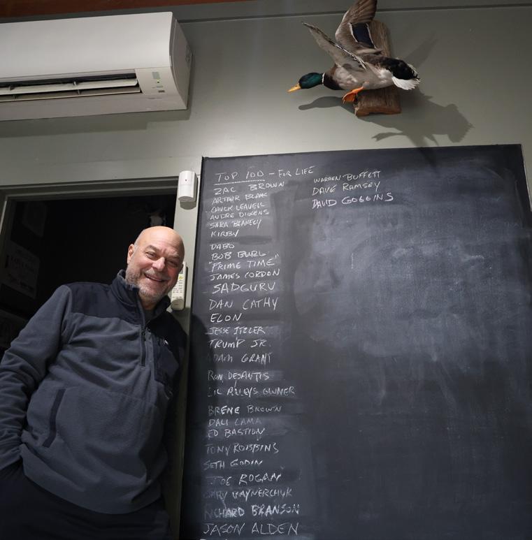 Framed awards and profile articles line the walls amid trophy mounts of snow geese, an impala, warthog, stags and other game he hunted himself. On a coffee table lay the four books he has authored. Along the top of another wall stretches his name spelled out in green letters, the sign from his first business, a men’s clothing store.