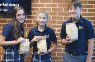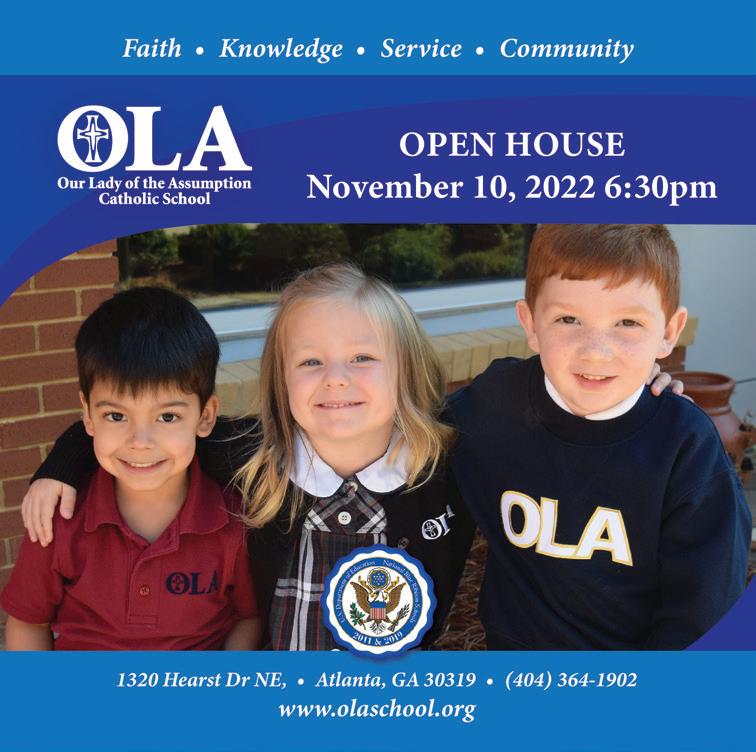 Located in Brookhaven, Georgia, OLA serves over 580 students in grades Pre-K through eight. Ninety-three percent of our students are Catholic and come from over 15 Catholic parishes. The Open House for prospective students is November 10 from 6:30pm – 8:00pm. Space is limited so visit our website to sign up for the eve ning. We are happy to offer school tours each Thursday at 9:30am from November through January. Please visit our Admis sions page on the website to sign up for a tour. For more information, please email Kathryn Brown at kbrown@olaschool.org.