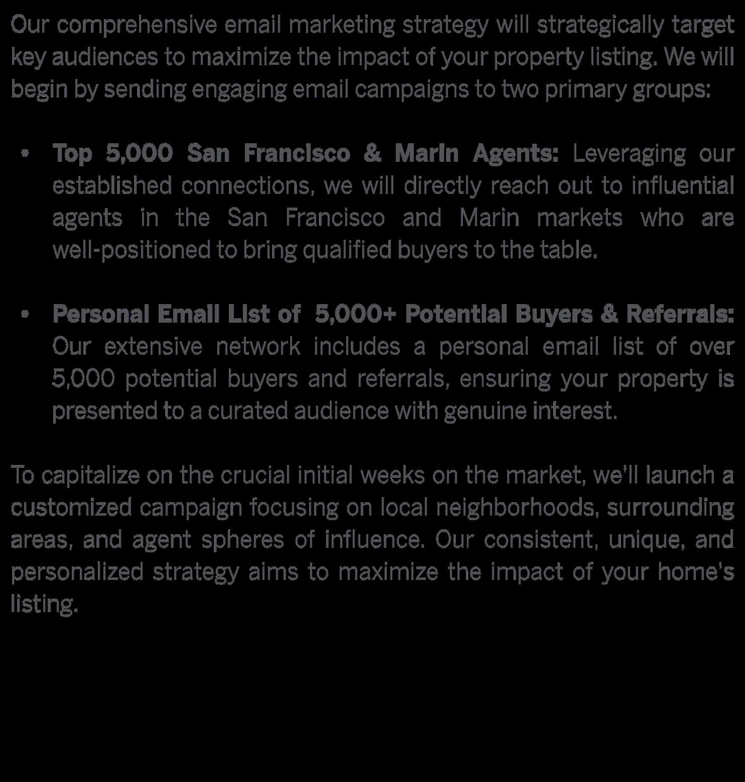 With an extensive network encompassing key players in both the Marin and San Francisco real estate markets, we proactively reach out to agents who are most likely to have qualified buyers for your property. Our approach involves personally informing them about the imminent listing, leveraging our broad connections to maximize exposure and attract potential buyers