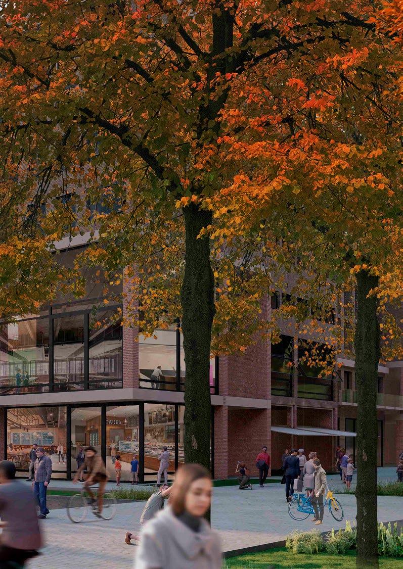 Het plan omvat 70 appartementen, verdeeld over vijf gebouwen en een circulair horecapaviljoen op een ondergrondse parkeergarage. TEKST BETTY ROMBOUT