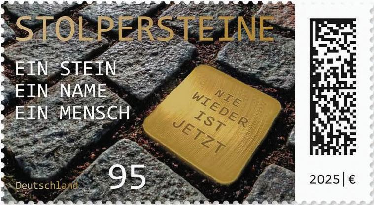 The Stolpersteine (stumbling stone) stamp was released in a sheet of 10 at the domestic rate of 0,95 € on December 4. The cobblestone design with a brass-colored stumbling stone in the middle bares the inscription, “Never again is now” (Nie Wieder ist Jetzt) as designed by Jennifer Dengler, of Bonn. The Stolpersteine plaque is hot stamped with semi-transparent gold foil. With the issue, Germany acknowledged its responsibility for the countless crimes against humanity committed under the Nazi regime. The first stumbling stones were laid in 1947 by German artist Gunter Demning, usually in front of “the last freely chosen houses in which the victims lived.” The stones are meant to represent a mental stumble, as anyone who passes by such a plate may pause to read it and hopefully reflect on the fate of the person memorialized.