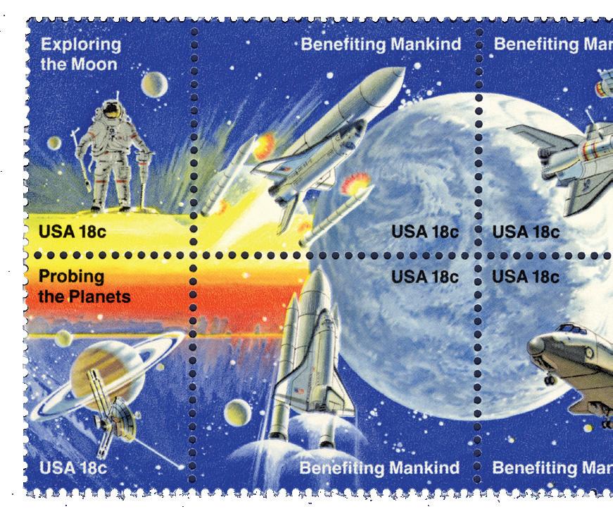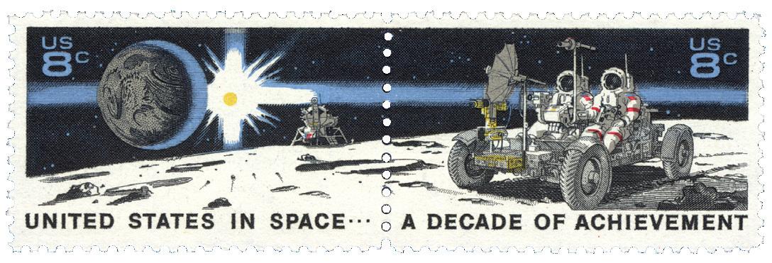 Ten years passed before the subject of Moon exploration appeared again on U.S. postage — on a very unusual sheet of eight stamps.