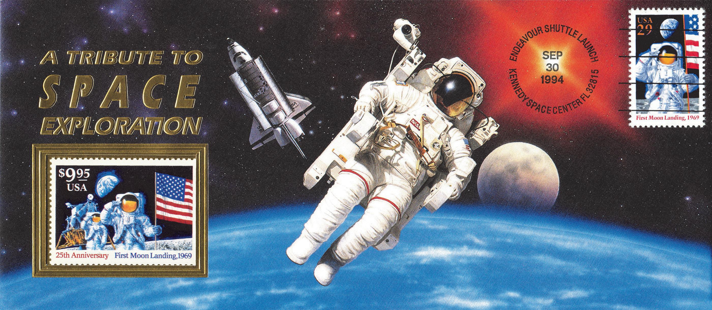 Space artist Keith Birdsong created a commemorative cover for the USPS depicting an astronaut floating above Earth with an embossed gold foil frame where a flown stamp was inserted (Figure 10). This item sold for $15.35 and was marketed primarily to stamp collectors.