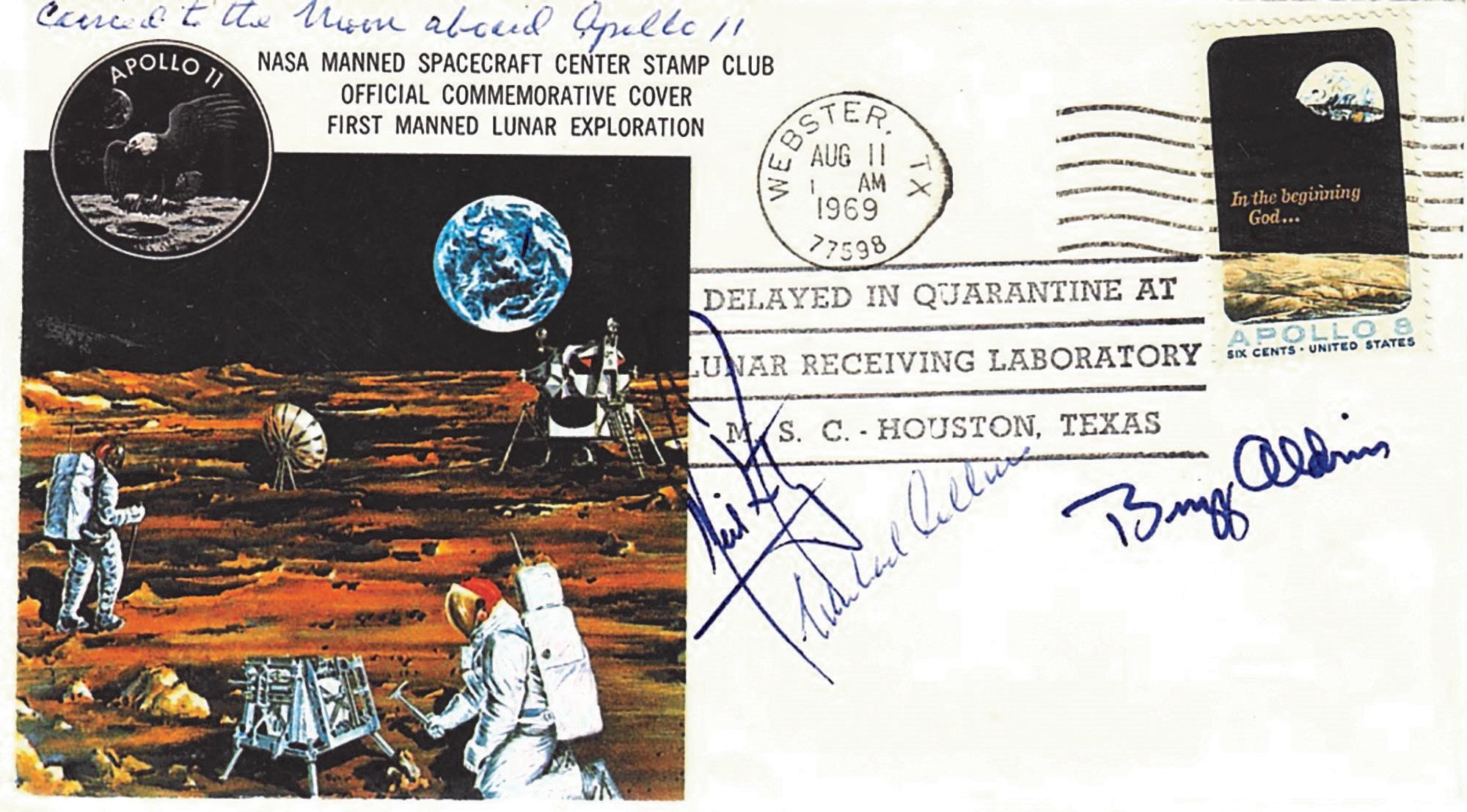 All were autographed by the three astronauts. Each has a handstamp “Delayed in Quarantine at Lunar Receiving laboratory M.S.C. Houston, Texas” and a Webster, Texas, August 11, 1969, cancel.