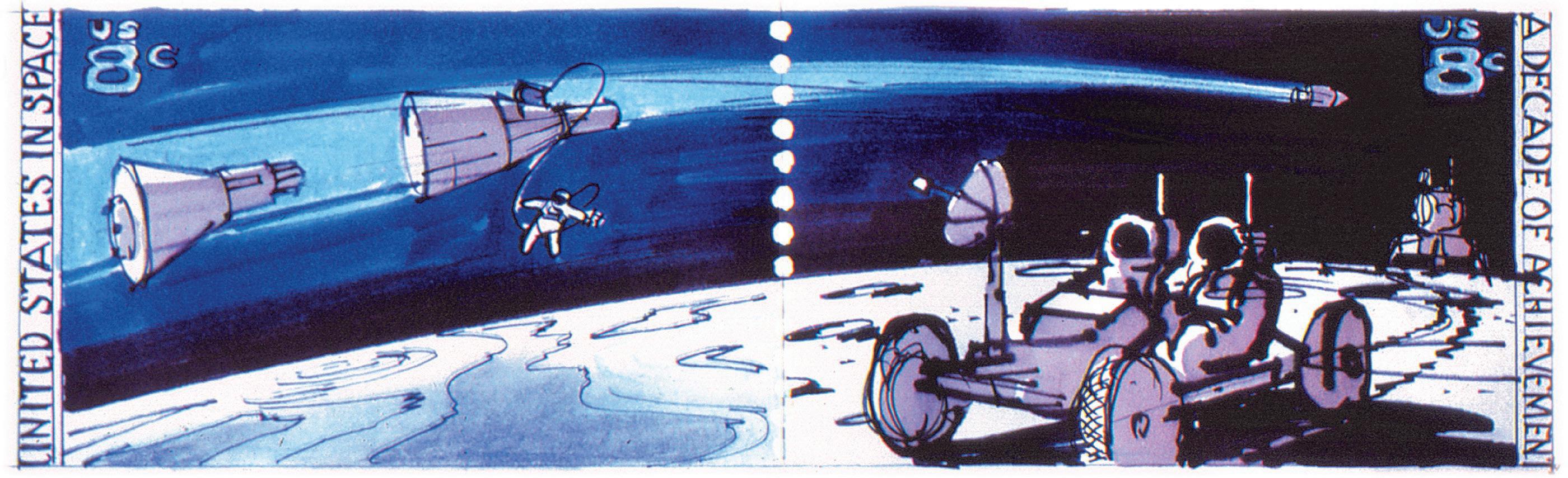 Visionary artist Robert T. McCall was THE guy to call for space stamps and this concept art for the “Decade of Space” se-tenant (joined) stamp has most of the elements in the final design, with a swoosh of the entire “Race to the Moon” team: the Mercury capsule, the Gemini capsule with a spacewalker, and the Apollo spacecraft on the same stamp as the roving lunar explorers.