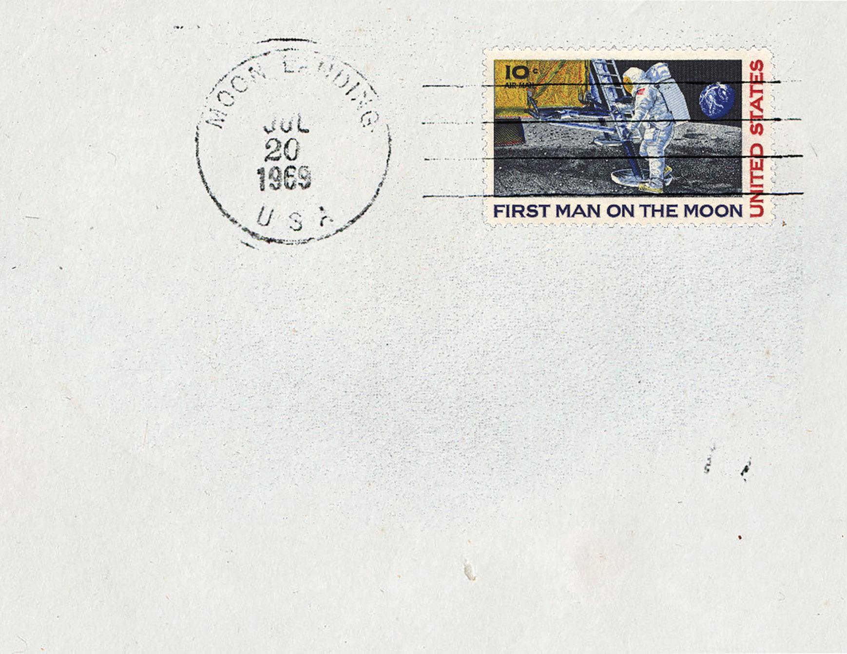USPS art director Carl Herrman’s concept for the Moon Landing stamp started with a scene of Armstrong on the ladder about to step foot onto the lunar surface. When Hermann saw that a majority of the 15 stamps featured people, he created alternate images to break up the monotony, and for the lunar stamp, settled on the iconic footprint, for which he lightened the dark tones and rotated to flow with the other 14 stamps in the tilted format.