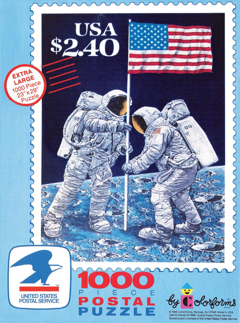 Among the perks of being a quasi-governmental postal agency is that you get to promote the stamps with spiffy programs and offer merchandising deals. Colorforms, a major puzzle manufacturer, cherry-picked some of the more popular stamp designs and put out a line of jumbo puzzles, including the 1989 20th Anniversary of the Lunar Landing stamp (Figure 8).