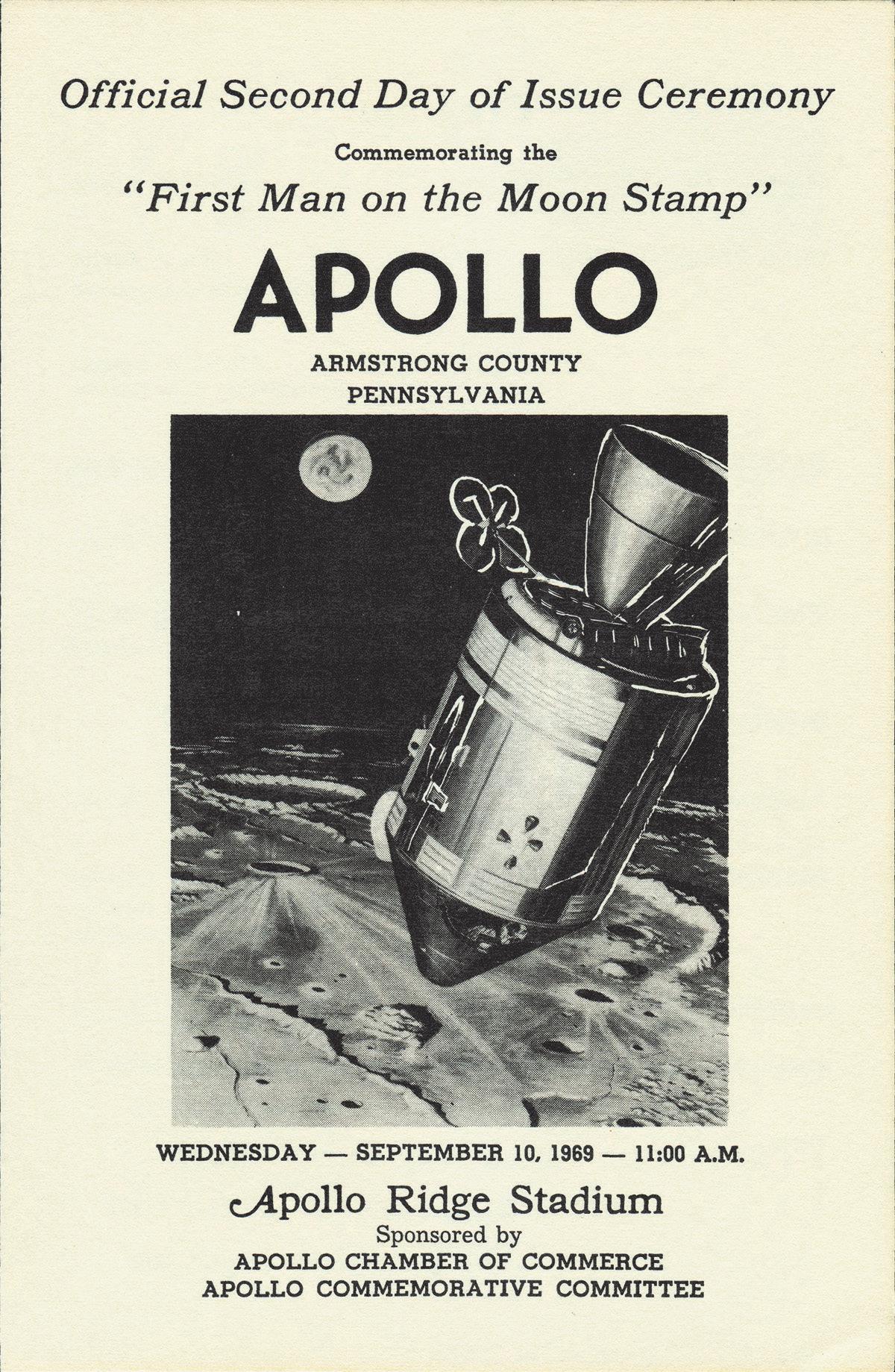 During a time when it was still a badge of honor to be an official first day of issue city, aldermen in Apollo, Pennsylvania wrote to the postmaster general asking to be considered for a first day ceremony. The Post Office Department nixed the idea, so the aldermen settled for the next best thing, declaring that they would have an “official second day of issue ceremony” at the Apollo Ridge Stadium, complete with dignitary speakers and a program.