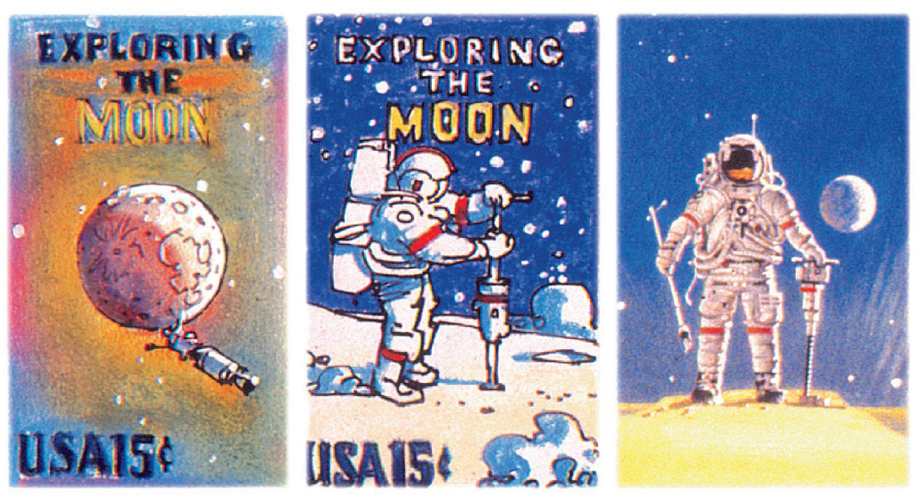 Chris Calle, an experienced stamp designer with a dozen issues to his credit, was selected for the artwork. Williams knew that Calle was the son of the 1969 Moon stamp designer, Paul Calle. The father-son link would be a publicity bonanza. Chris included several “stamp-on-stamp” designs, using his father’s 10-cent Moon Landing stamp in his concept sketches (Figure 7).