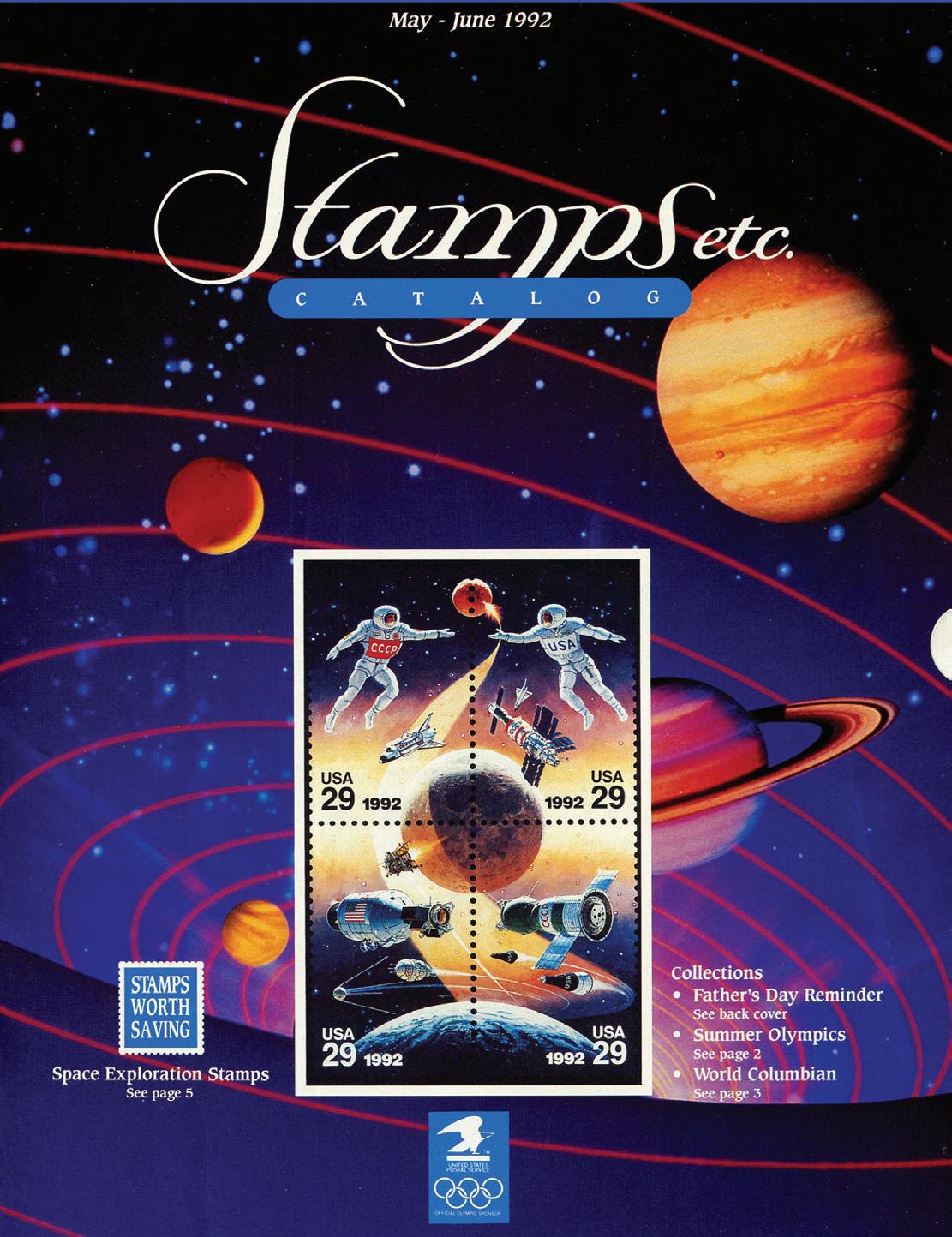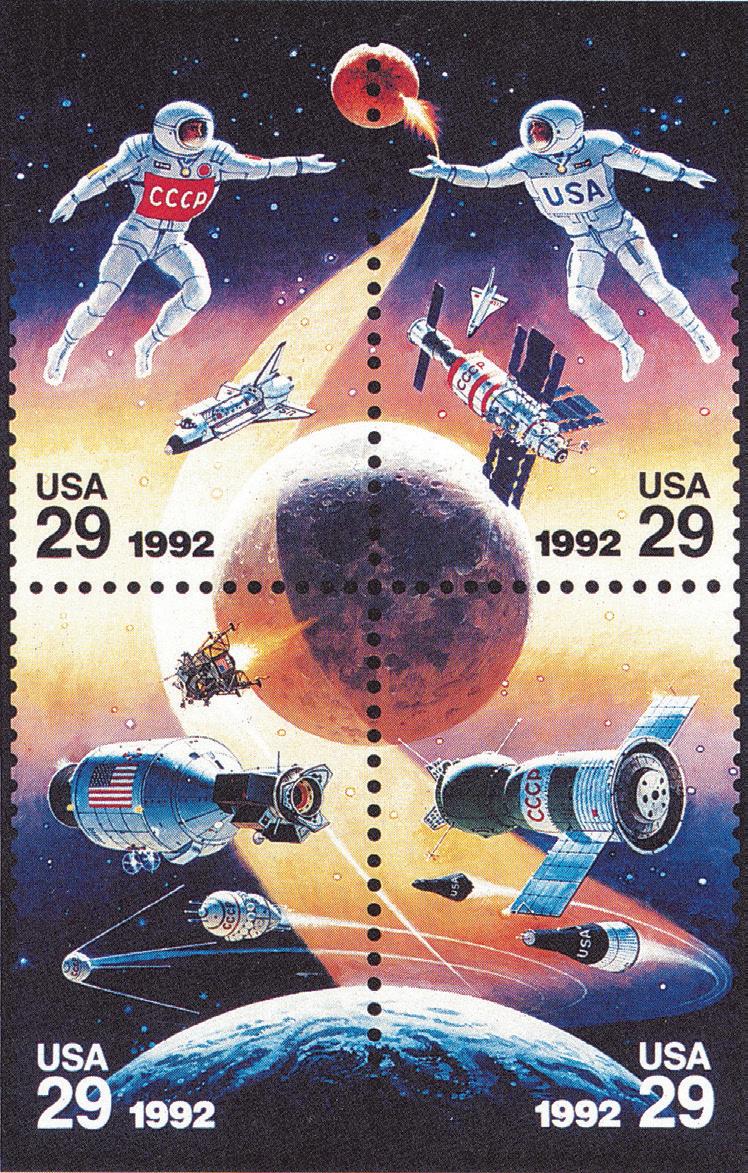 The 1992 summer issue of the USPS stamp catalog USA Philatelic (Figure 9) featured a preview of a new Space Accomplishments joint issue. The observant reader will note that the astronauts are wearing “USSR” and “USA” banners to signify the two nations’ accomplishments in space. Then, politics happened and suddenly there was no “USSR” anymore, which had artists McCall and Beilin scrambling to repaint the master artwork to reflect the new political situation.