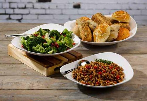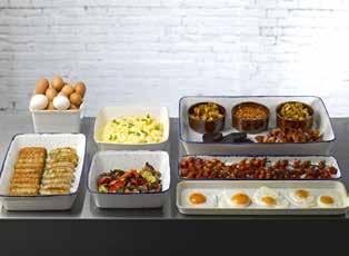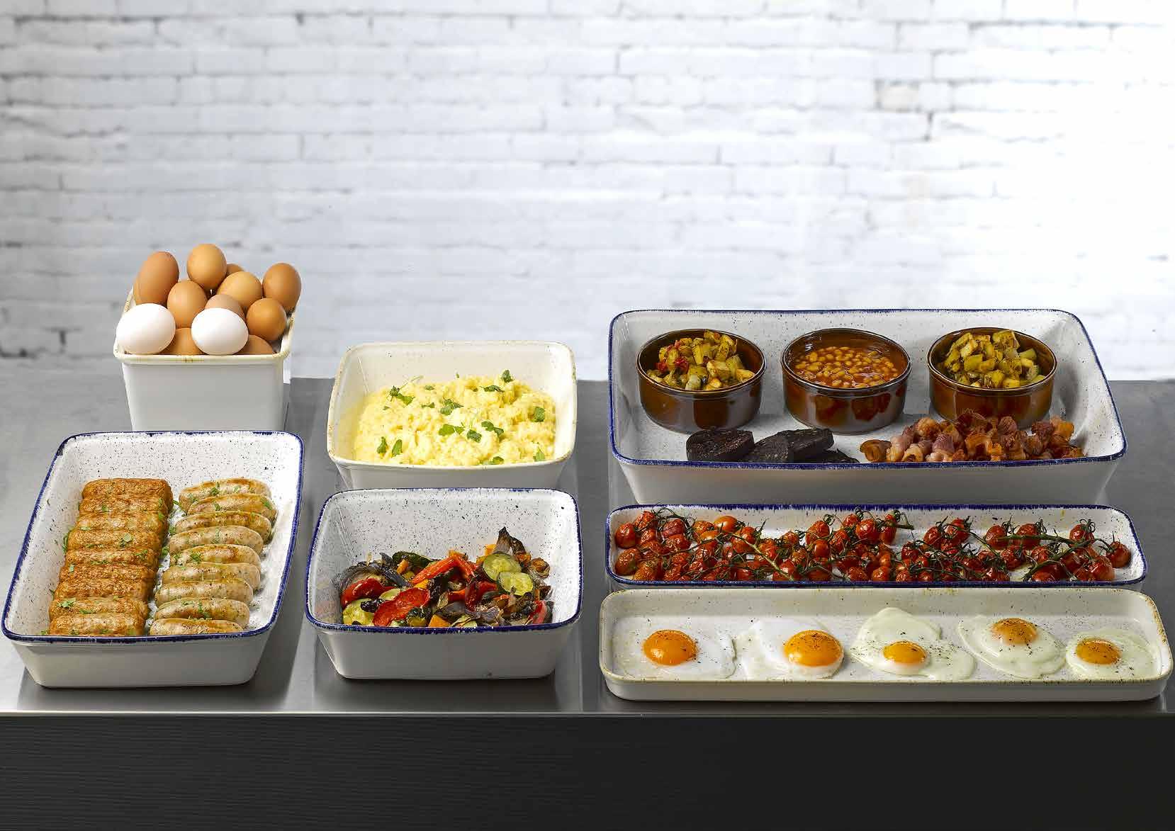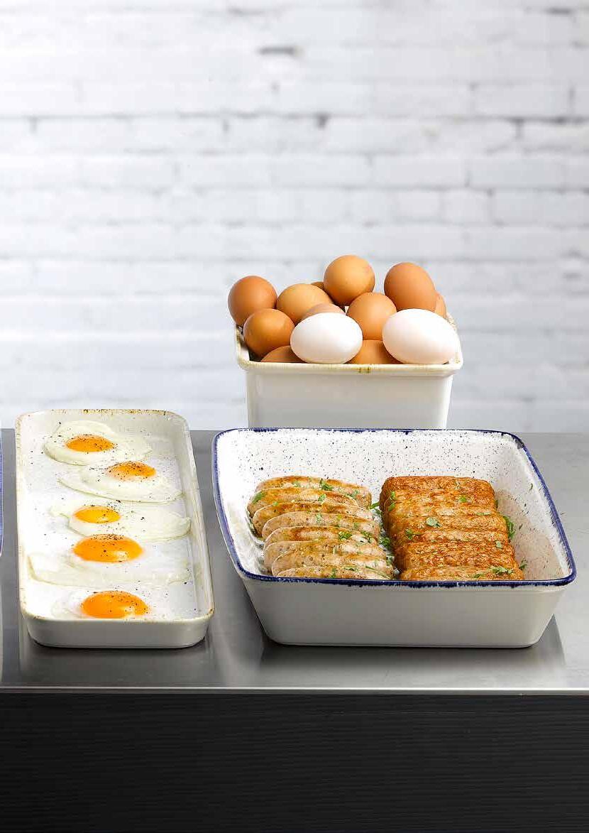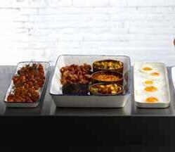 Les petits déjeuners copieux et les plats chauds maintenus en température sur plaques ou bains-marie sont servis dans des plats Counter Serve modulables et peu encombrants.