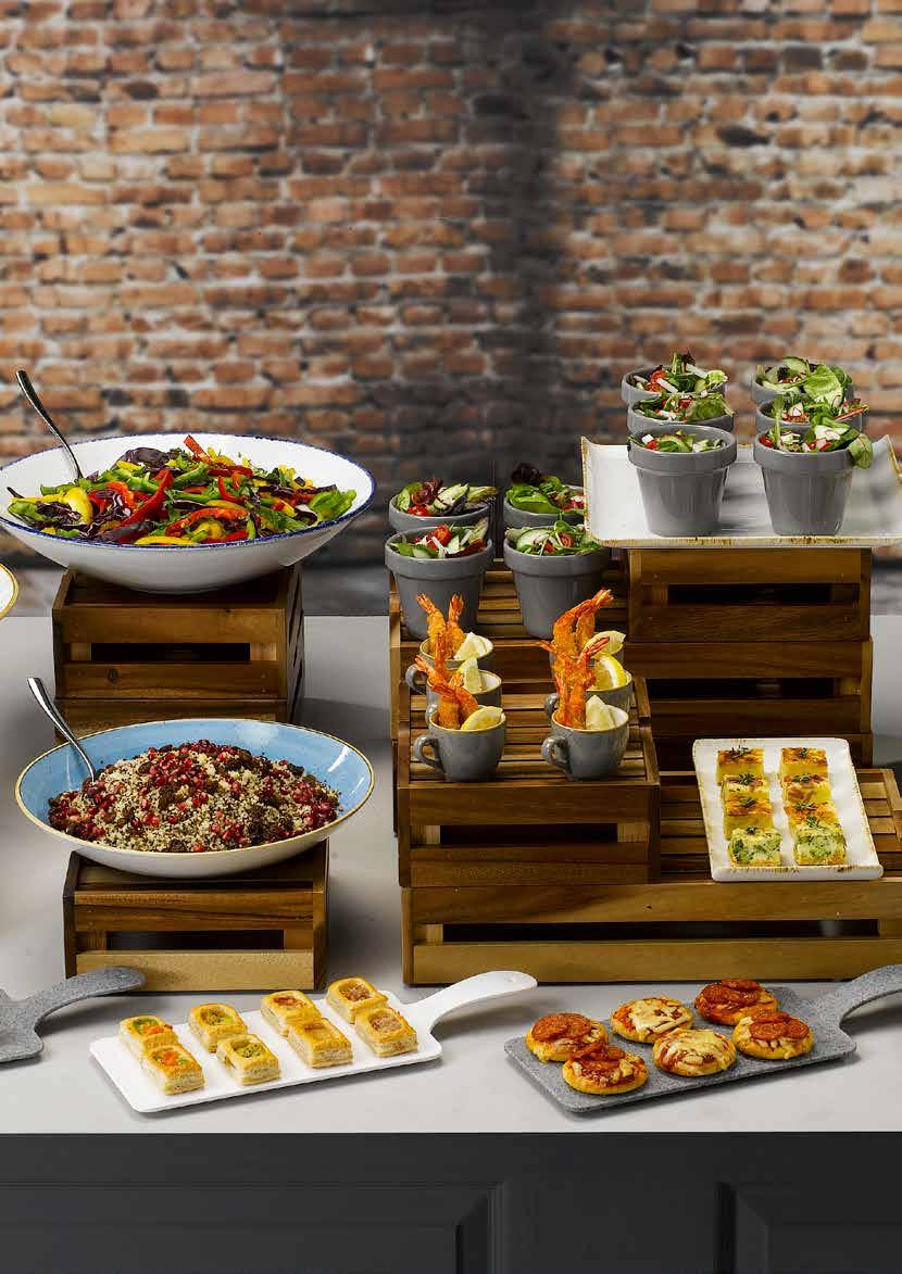 Designed with hospitality trends in mind, including elegant risers to add height to eye catching buffet displays and paddle boards ideal for sharing platter and tapas.