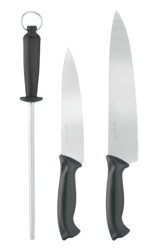 Including 2 knives and 1 sharpening tool.
