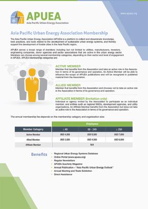 APUEA serves a broad range of members including but not limited to utilities, manufacturers, investors, engineering companies, donor agencies and sector associations that are active in the urban energy sector. Members can choose among several membership categories, depending on their sector and level of engagement in APUEA.