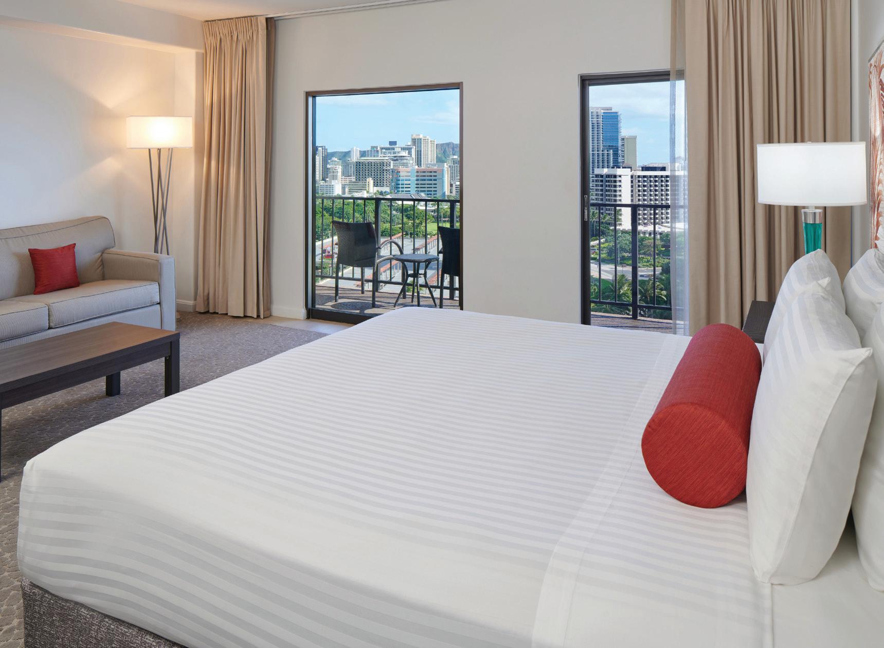As downtown Honolulu’s only all-suite condominium resort, Aston at the Executive Centre Hotel is ideal for business travelers who seek comfort and convenience combined with business amenities and exceptional service. Located within walking distance of the Hawaii Capital Historic District, government offices, the city’s financial district, and Hawai‘i Pacific University, the hotel's 1-bedroom executive suites have fully equipped kitchens, while business suites offer wet bars and mini refrigerators. All suites have separate sleeping areas and floor-to-ceiling windows offering expansive views of the water, mountains, or city landmarks, including the nearby Aloha Tower.