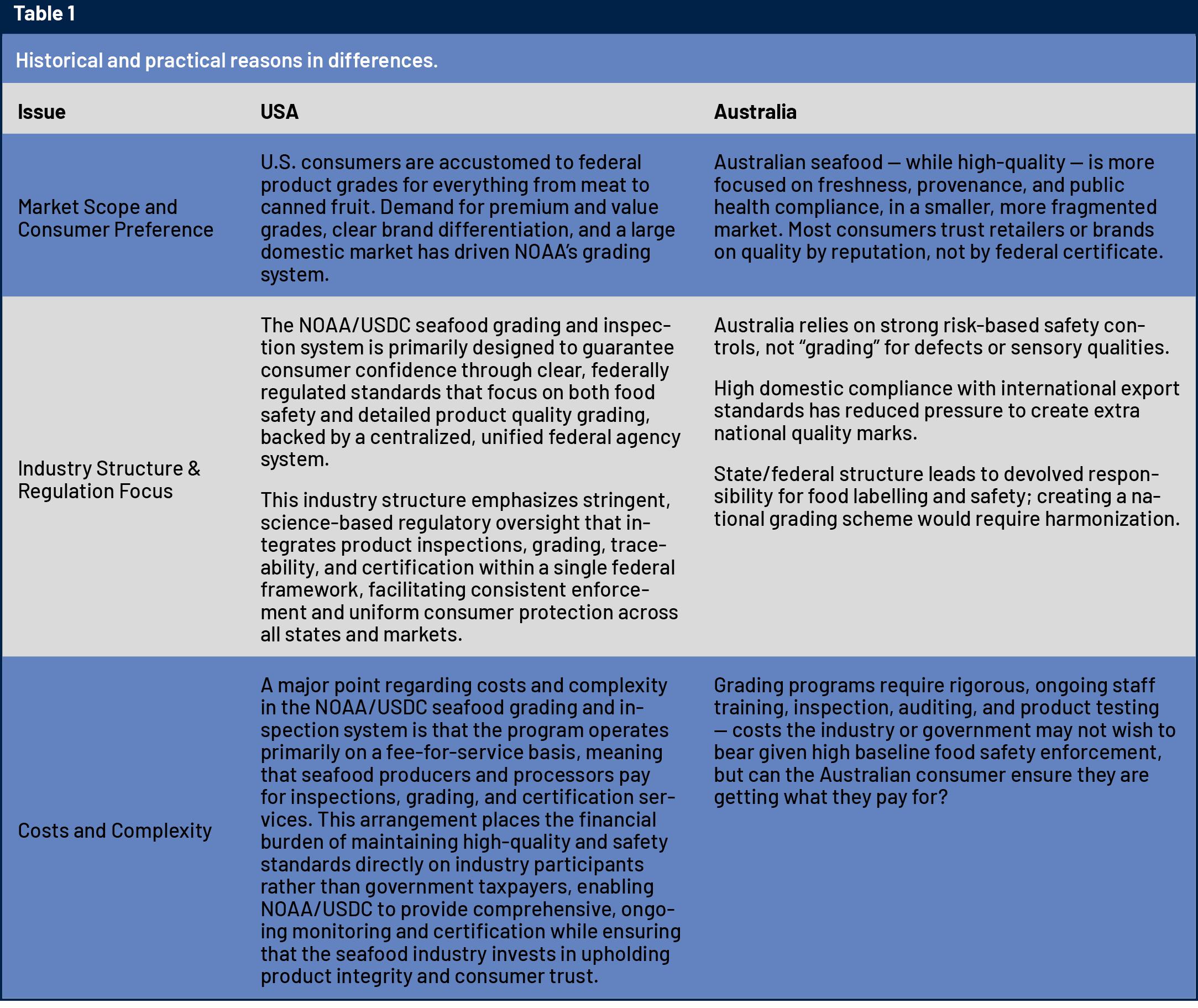 In essence, the Australian and U.S. seafood frameworks reflect different historic, cultural, and regulatory paths: one leaning towards federally mandated product grades and integrated quality standards, the other prioritizing stringent safety