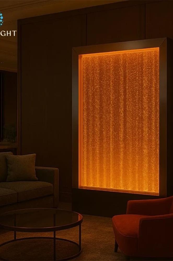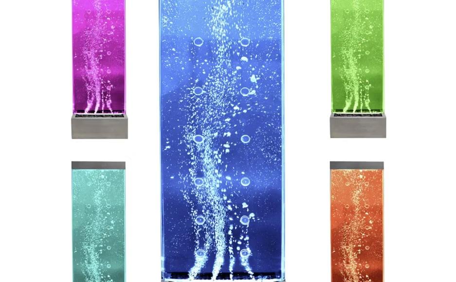 A transparent acrylic panel showcasing a magical underwater environment — dancing bubbles rising under colourchanging LED lighting.
