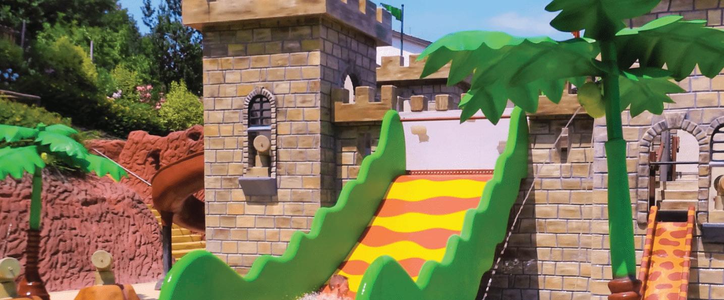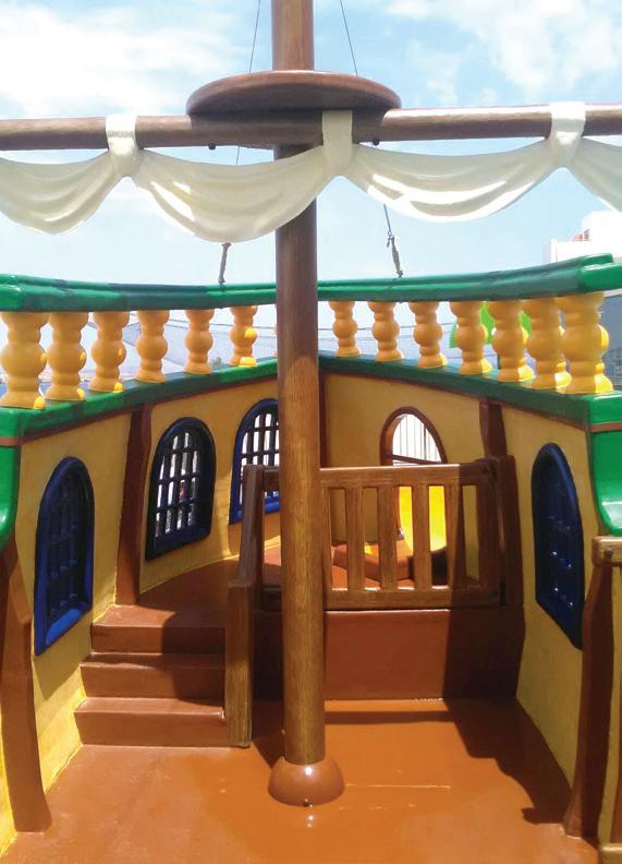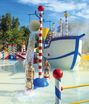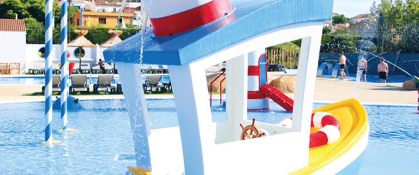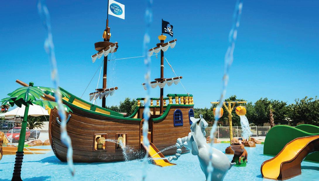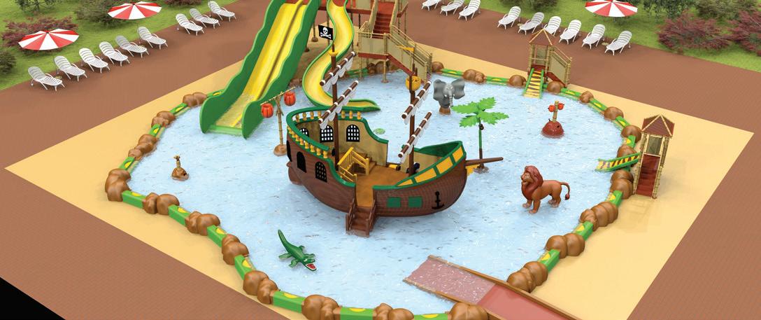 Réalisation : conception et fourniture d’un bateau pirate en fibre de verre comprenant une glissoire, des canons et des jets d’eau.