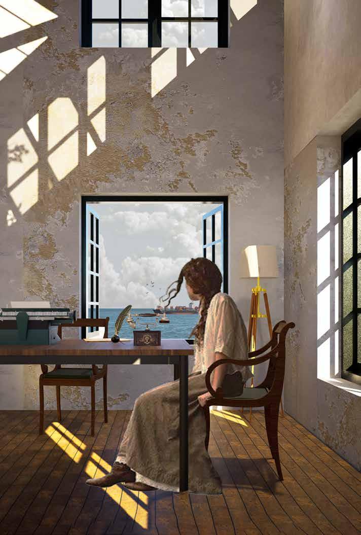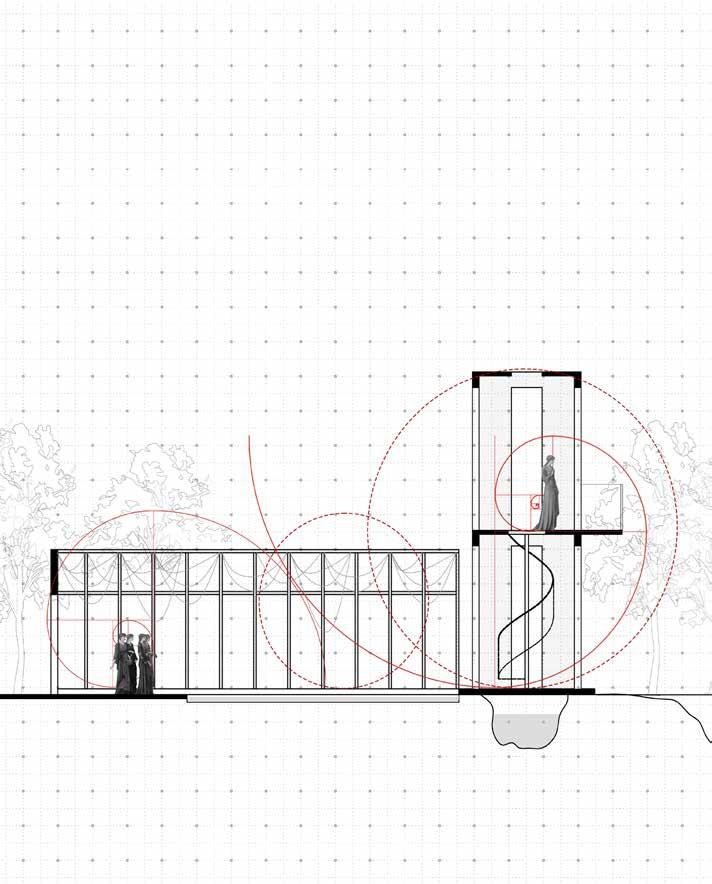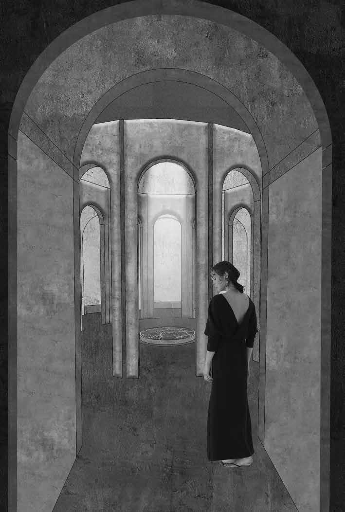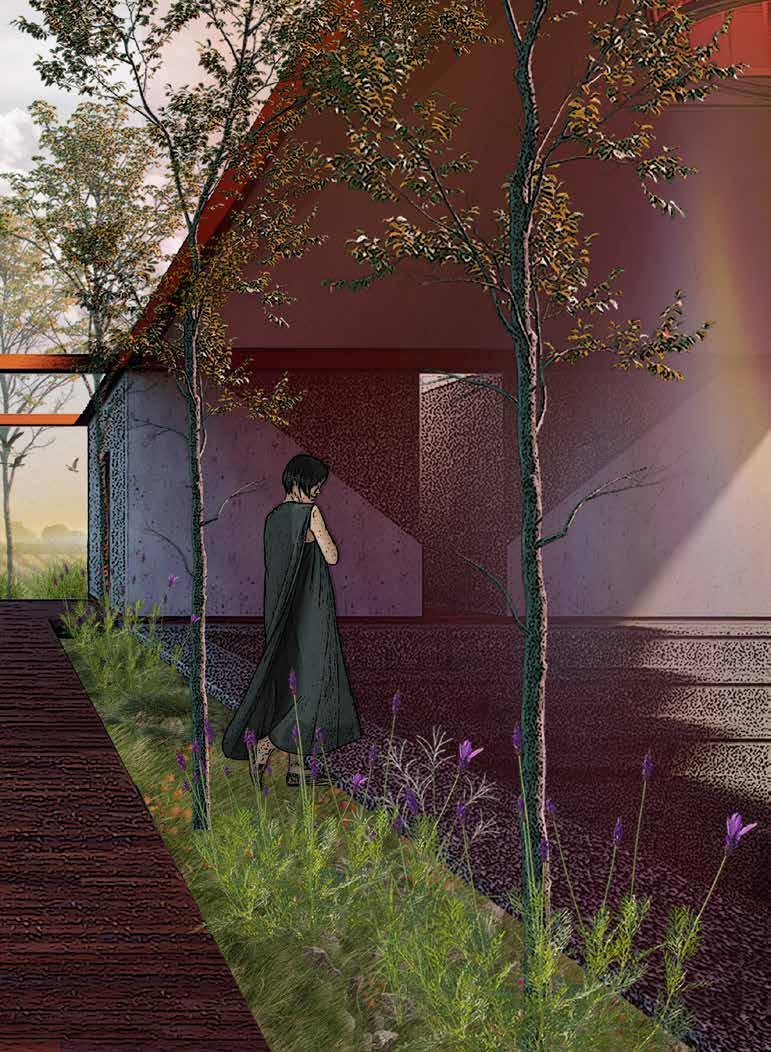 The spaces represents a symbolic journey—one of solitude, reflection, and choice. Inspired by spiritual initiation rites, it guides the individual from shared spaces to isolation. A wall divides, a platform gathers, and descending levels offer layers of experience, from the serenity of a walled garden to a place of release and renewal. Beyond, an isolated tower stands as a distant beacon. Through a long, contemplative path, one ascends its stairs to the summit—an intimate space to pause, reflect, and decide: to embrace an ending or summon the courage to return to life, renewed and transformed.