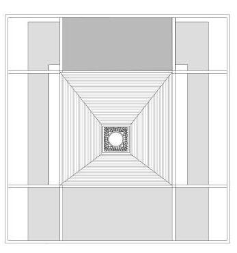 The grids supporting the pyramidal roof create a solid apperance, leaving a central void that allows sunlight to pour in.