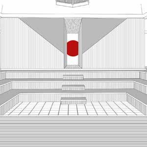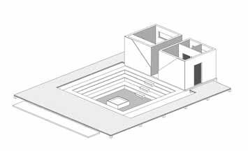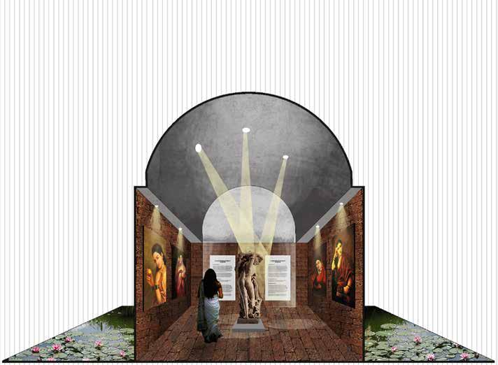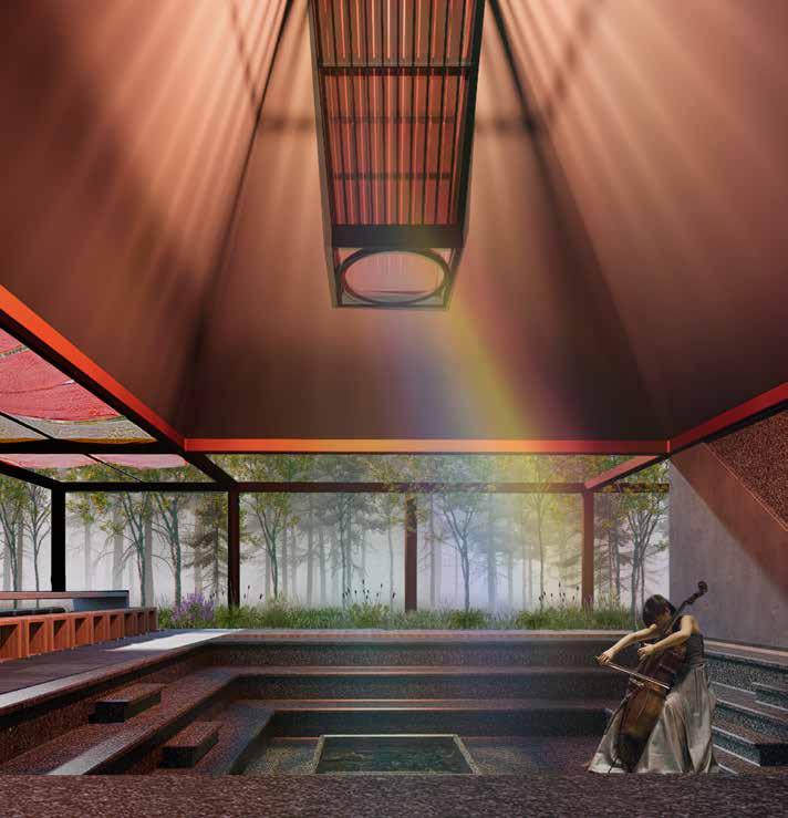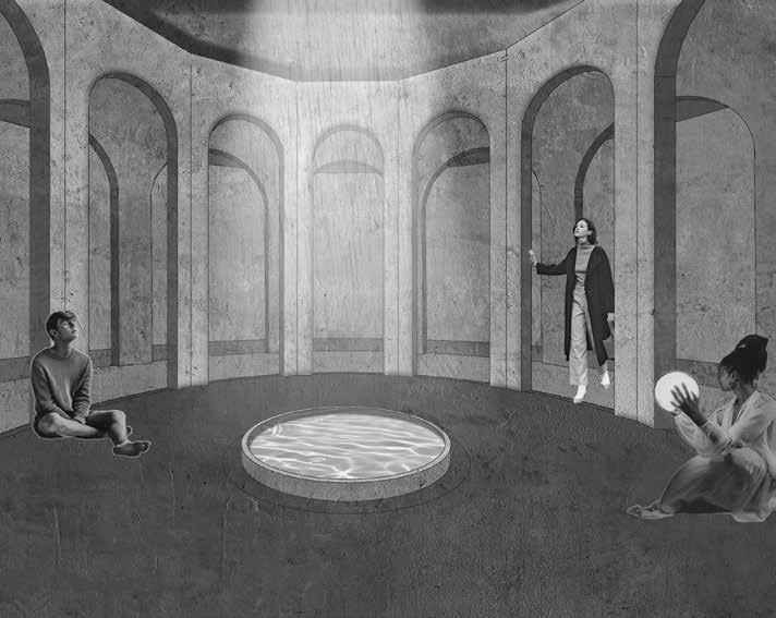 Theserene interior space is designed for immersive experiences where architecture, nature, and performance harmoniously converge. A central prism, mounted within the roof’s open void, captures the sun’s rays from sunrise to sunset, casting dramatic beams of natural light across the interior. In the absence of daylight, a carefully designed artificial lighting system creates warm, ambient illumination that filters softly through the space. At the center, a reflective water body subtly mirrors light and movement, adding depth and tranquility to the scene. This interplay of light highlights the textured walls, creating a soft, ethereal ambiance that enhances the spiritual quality of the space.