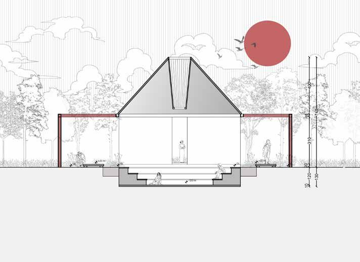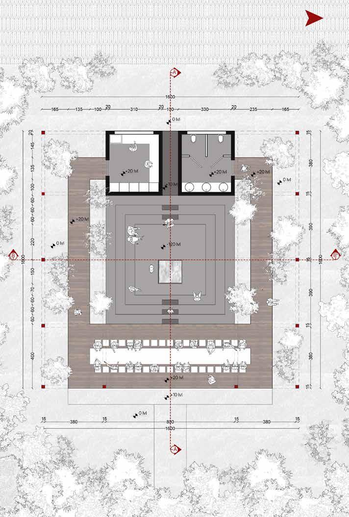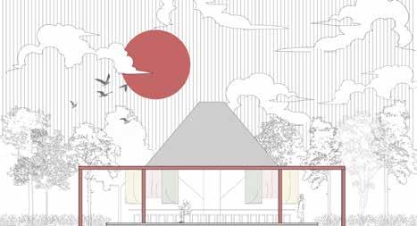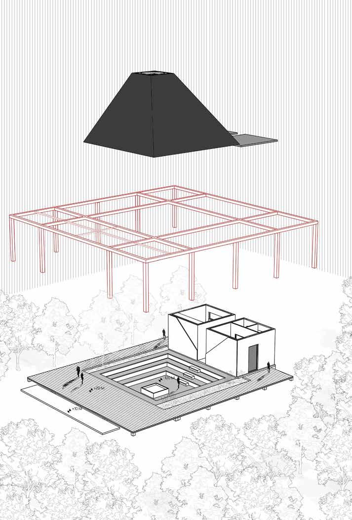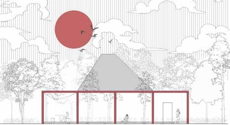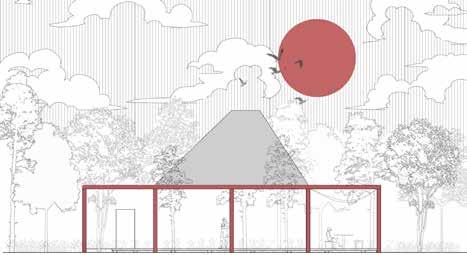 Nestled within the woods, the structure stands out with a striking red frame that defines its presence without disrupting the natural surroundings. Its trapezoidal black roof appears to float, featuring a central void that invites natural light to illuminate the interior. A central square water body reflects light and enhances the serene atmosphere. The entire structure is interconnected by an elevated walkway that wraps around the space and links the different sections, improving accessibility and flow.