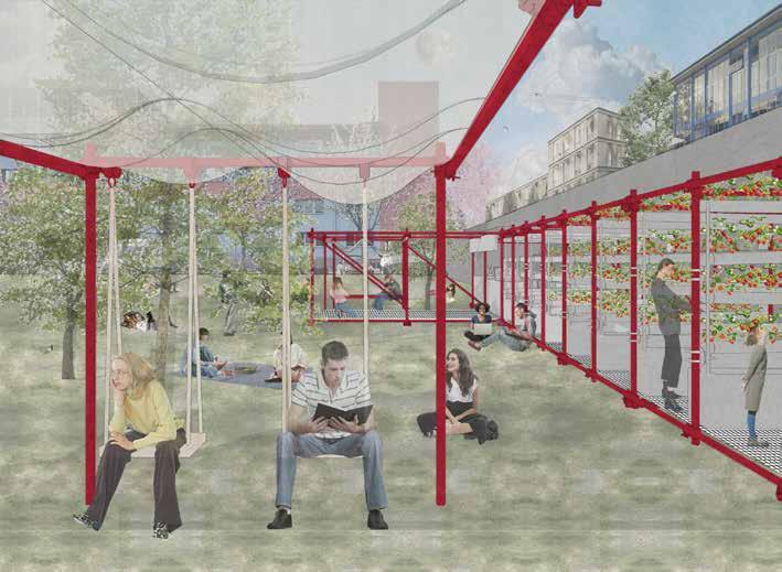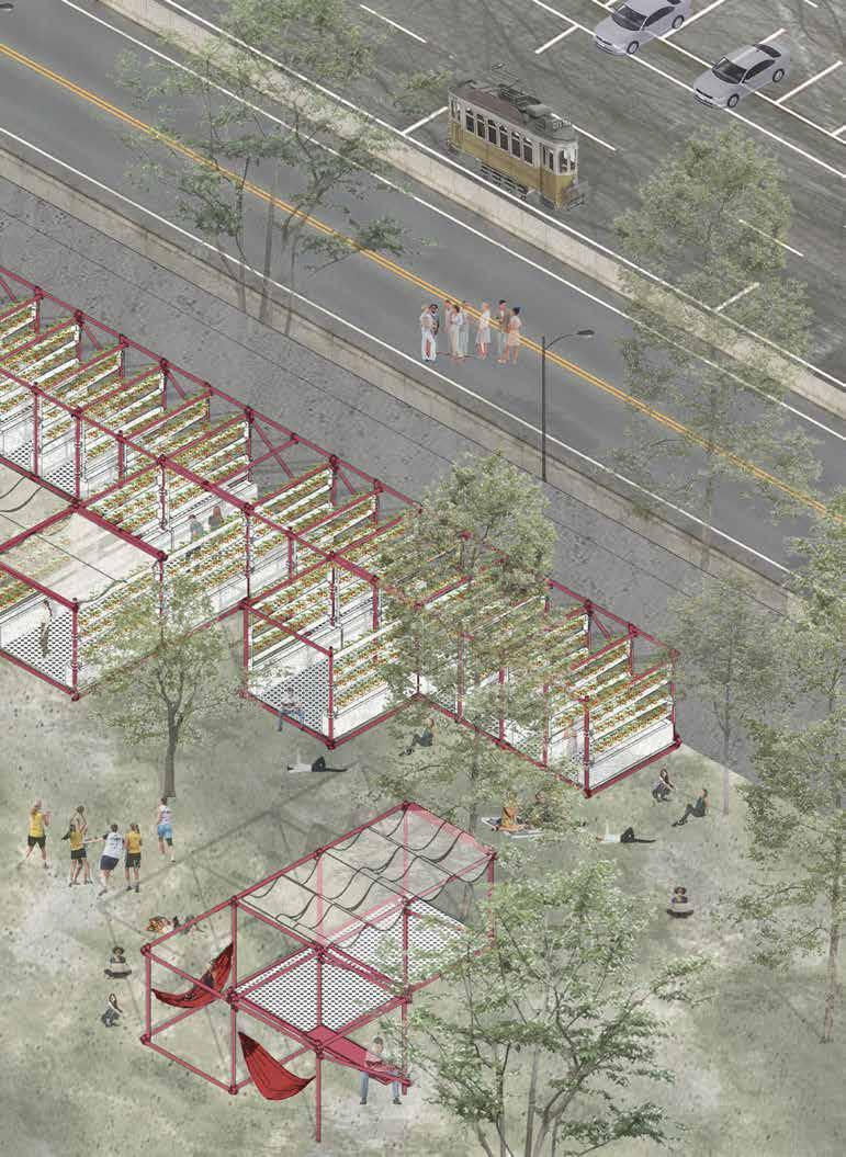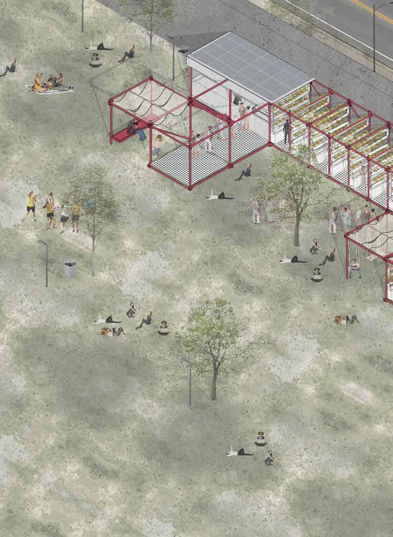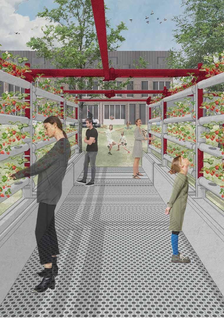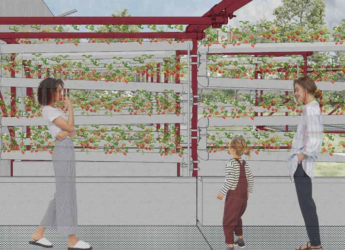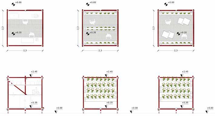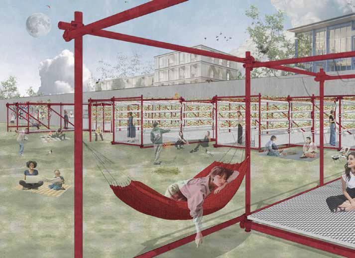 wall into a prototype for adaptable urban farming. This system is designed to be flexible—scaling and reconfiguring based on campus needs. By integrating kitchen, dining, farming, and leisure spaces within a single unit, we create a multifunctional, sustainable environment.