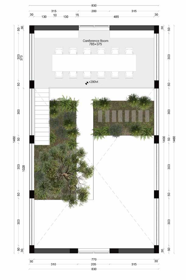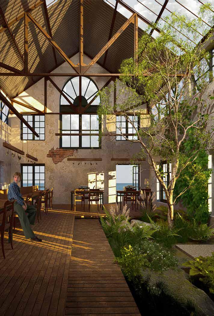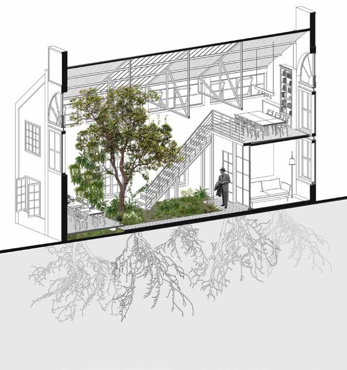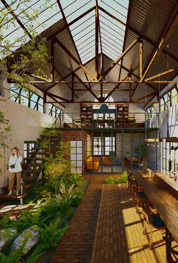 Preserving the remains of the original flooring and the strong, enduring tree keeps the past alive. Allowing plants to grow freely on the ground and walls creates a natural connection and a new roof sheet. In the middle used transparent roof sheet to ensure natural light.